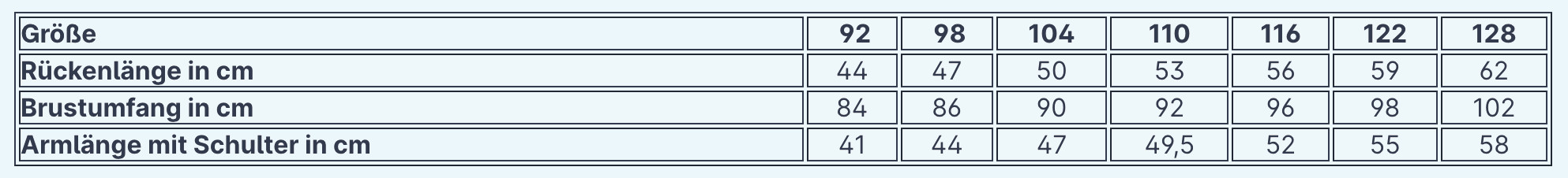 Bitte nimm das Maß an einer Jacke Deines Kindes (nicht am Kind, das wird zu ungenau) und vergleiche die Werte mit der Tabelle.